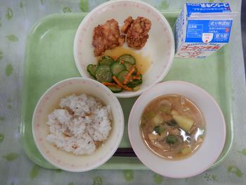 献立名: うめちりめんご飯 鶏肉のから揚げ ピリ辛きゅうり みそ汁 牛乳