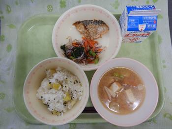 献立名:さつまいもご飯 鯖のごまだれ焼き みそ汁 ゆかり和え 牛乳