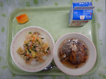今日は、人気の高いチキンカレーライスです。給食室で、調理員さんが、小麦粉からルウを作って、じっくり煮込んだ手作りカレーです。慌てずによく噛んで食べましょう。デザートは「杏仁ポンチ」です。杏仁ポンチの杏仁は牛乳から作られています。牛乳が苦手な人も、杏仁豆腐なら食べられるでしょうか。でも、牛乳もしっかり飲んでくれたら嬉しいです。