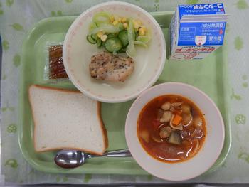 今日のスープは「ミネストローネ」です。「ミネストローネ」は、イタリアの田舎の家庭料理のひとつで、決まったレシピはなく、それぞれの家庭で食材や味付けが異なるそうです。今日は、ベーコン・玉ねぎ・人参・なす・ズッキーニ・トマト・ひよこ豆・あさり。マッシュルーム・マカロニ・パセリと多くの食材を入れて、ケチャップ味に仕上げました。野菜が苦手な人も食べやすいと思いますので、良く噛んで味わいながら食べてくれたら嬉しいです。