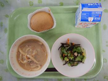 献立名: ごまだれタンタンうどん 鹿尾菜とひよこ豆のサラダ きな粉蒸しパン 牛乳