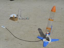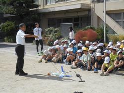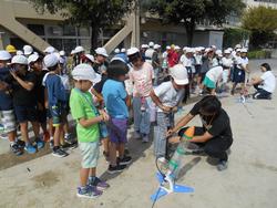 「水」とは違い、「空気」は体積を小さくする(縮める)ことができ、それをエネルギーに変えることができます。4年生皆が押し縮めた「空気」で校庭に高く打ち上がったこの「ペットボトルロケット」実験でそれが体感できた楽しい学習となりました。