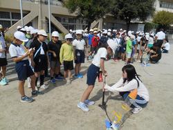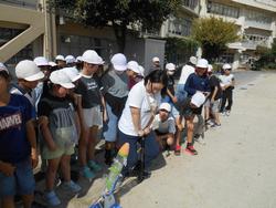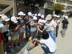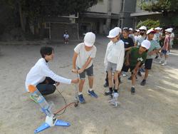 4年生は理科で、「とじこめた空気や水」の学習をします。先日は「水を閉じ込めた時」にはどうなるかを、教室や校庭で「水鉄砲」を使って確かめる実験をしましたが、今日は「空気を閉じ込めた時」の力を実感できるよう、校庭でペットボトルロケットの実験をしました。今回、ご協力いただいたのは、教材でもお世話になっているスタッフさん。最初に説明を聞いてから4クラスに分かれてペットボトルに空気を入れていきました。
