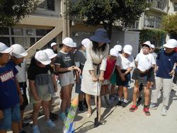 もっと遠くに飛ばそうと、第2回目に挑戦。今度はペットボトルロケットに入れる水の量を増やしての再挑戦です。4年生の子供たちが誘ってくれて、私も挑戦。皆が頑張って空気を入れてくれていたので、ペットボトル内の圧力は最高潮!子供たちの応援がとても嬉しく、力が入りました。そして、2回目カウントダウンで発射!1回目は校庭中央あたりまで飛びましたが2回目は幼稚園舎側の校庭まで飛びました。
