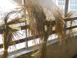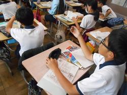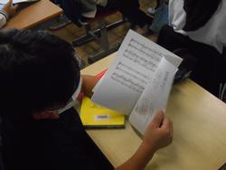 5年生は、教室に入ると総合的な学習で育ててきた「稲」が窓辺に干してありました。しっかり穂が付き実がなってよかったです。5年生はそろそろ11月の音楽集会に向けて選曲を終え、今日は楽譜が配られていました。どのようなメロディーなのかをつかむため、曲を流して確認していました。