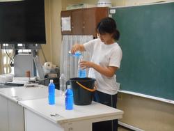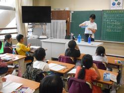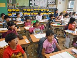 1年生は、算数「どちらが大きい」の学習です。幅が広くて高さは低めのボトルと、幅はせまくても高さは高いボトル、さてどちらが容量は大きいのでしょうか。「かさ(容積)」の素地となる学習です。どのようにしたら比べられるのか予想を立ててから実際に先生が前で見せてくれますが…さて結果はいかに?