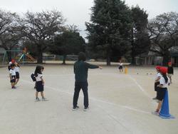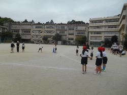2年生は、校庭で「スローベースボール」をしていました。ソフトボールと同じくらいの大きさで、小さくて柔らかなボールを投げたり、それをキャッチする間にベースを回ります。やり方を確認し、その中でルールを学びながら学習していきます。ボールを自分の投げたいところまで投げることも、それをキャッチすることも最初は難しいものです。ボールの扱いを身に付けつつ、ゲームをしながらルールを理解し、さらにはクラスごとの独自ルールも付け加えて行っています。