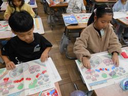 今年度から全校で算数科の授業研究を行っています。今日は、4、5時間目に研究授業を行い、その後、授業についての研究協議を行います。4時間目の授業は2年生。「新しい計算を考えよう」の学習…いわゆる「かけ算」の最初の学習です。全部の数を手際よく数える方法を考えます。