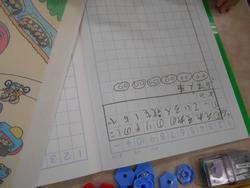 遊園地にある乗り物や自転車など、「同じ人数」でいくつかの数にのっている全ての人数を数えます。「2人ずつ」、「3人ずつ」といろいろなパターンで図や絵、式を使って考えていました。