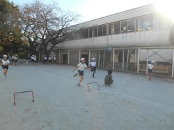 4年生は体育・ハードル走。ミニハードルだけでなく、先生の手作り教具を使って、ハードル等の距離がそれぞれ違う6コースが設定されていました。自分の歩幅にあった場所を子供たちが選んで練習していました。