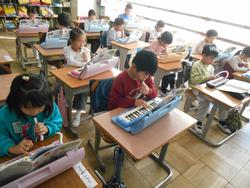 1年生は、鍵盤ハーモニカの練習。入学してからいろんなことができるようになった1年生。今日はそれぞれが「日の丸」を一生懸命に吹いて練習をしていました。これから「きらきらぼし」の練習に入っていきますが、そこでも使う音が入っているのでこの後につながる学習です。タンギングも意識して練習をしていました。