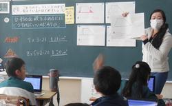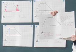 5年生は、算数で図形の面積の学習をしています。今日は「台形」の面積の求め方を考えていました。