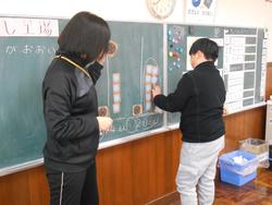 また、算数で「大きさ比べ」をする時には、模擬硬貨を使って「10」をくずして大きさ比べをする方法を皆で考えていました。