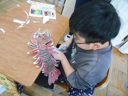 なかよし学級では、松戸市交流学習会で使う小道具の準備です。大きく描いた絵の色塗りやはさみを上手に使ってカーブをかけて切ったりして、それぞれ役割分担しています。
