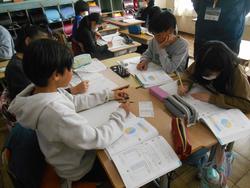 5年生は、算数「割合」で、円グラフに表すことをグループで学習したり、社会科で「日本の自然災害」について調べたり、音楽「子守歌」で発表を聴き合ったりしていました。