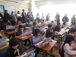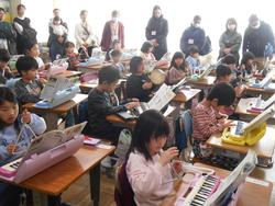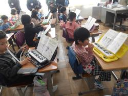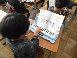 いよいよ、今日の学習のめあて「みんなで合わせて楽しもう」のめあてのもと、トライアングルやタンバリンも入れて合奏をしました。鍵盤ハーモニカの演奏も上手でしたが、トライアングルやタンバリンが合わさったことでより楽しい曲を味わうことができました。