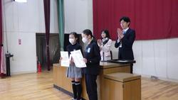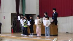 今日で令和7年度の1年が終わります。開始予定時刻よりも早く2~5年生が集まり、静かに待つ姿。この姿だけでも子供たちの成長が感じられます。修了式の前に今年度最後の表彰を行いました。千葉県小中学校書初め展及び明るい選挙啓発習字作品コンクールで優秀な賞をいただいた代表児童です。