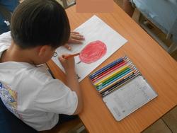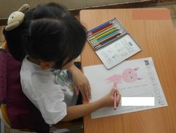 名前を書いた後は、ワークシートの余白に自分の好きなものの絵を描きました。大きく、そして色塗りも丁寧にしています。小金小学校の絵を描いてくれている子もいました。とても嬉しいことです!中には絵をもっと描きたくて、自由帳に小金小学校の絵を描いてくれている子もいました。