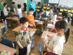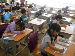 皆がかき終えた頃合いを見計らって名前を書いたカードをお互いに見せ合って友達に伝える活動もしました。相手を励ます声掛けをしている1年生がいたのは驚きと共に素晴らしいことで、たくさん褒めました。優しい気遣いのできる素敵な姿です。