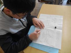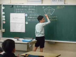 6年生は、算数で「線対称」の学習をしています。対称の軸からどのように辺や角をとっていけば線対称な図形になるか、それぞれ作図をしています。また、作図する際にどのようなところに気を付けるのか、特徴は何かを皆で確認していました。