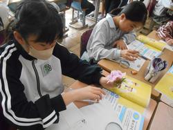 5年生は、理科で「花のつくり」の学習です。ルーペで花びらやがくを見て、そのつくりを観察します。