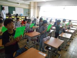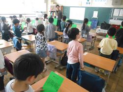 今日の1年生は、道徳、国語、音楽です。私が1年生の教室に行った時にはちょうど音楽の学習中でした。今日の音楽のめあては「校歌をおぼえよう」です。1年生の子供たちが手にしている緑色のものは下敷きです。PTAさんからの入学記念祝いとして、小金小校歌が印刷されています。
