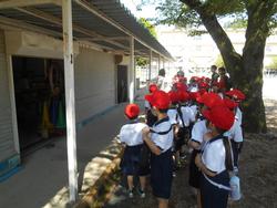 そして、体育の用具がしまってある体育倉庫の場所も教えてもらいました。先生たちがいる時にしか使えませんが、体育で使う用具がこの倉庫にしまってあることも初めて学びます。