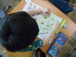 日がさんさんと差す校庭で1時間過ごした後は、教室に戻って業間休み。次の時間は算数です。算数セットからブロックを出し、「なかまづくりとかず」の学習です。