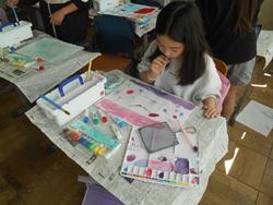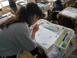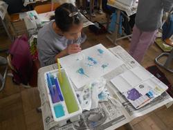 4年生は図工です。身近な道具を使って絵具での表現方法を工夫して作品を作っていました。スパッタリングやドリッピング(ストローで吹く方法)、マーブリングなど、様々な方法で淡い色や色の変化を楽しむ素敵な作品となっています。