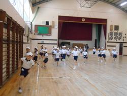 体育館では、3年生が楽しそうに走り回っていました。すると、足ジャンケンが始まりグループが出来ていきます。そして、次のゲームに移ります。先生とジャンケンをして勝った時のコース、負けた時のコースが伝えられ、そのコースを走り終えたら先生のところに戻ってくるというゲームです。