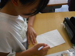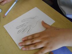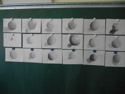 6年2組が図工の授業。学習内容は「えんぴつ筆を使って手をかこう」です。他クラスで行った鉛筆で描いた「ボール」の作品でイメージ化を図り、その後、実際に自分の手をよく見ながら描いていきます。