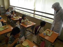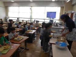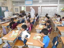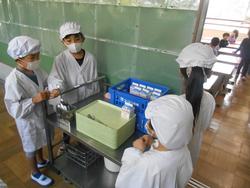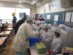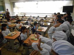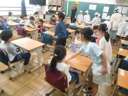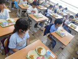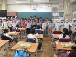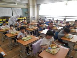 1年生も立派です。配膳がされるまで、席について静かに待ちます。2年生全クラスが1年生4クラスに分かれて手伝ってくれたので、とても早く準備ができました。栄養士さんも配膳前から1年生の教室に来てくれて、休職準備の様子を見てくれています。全ての配膳が済むと、1年生から2年生に「ありがとうございます」を伝えます。2年生は、「頑張って食べてね!またね!」と手を振って1年生の教室を出ていきました。