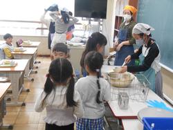 給食当番のやり方、配膳の仕方、皆のテーブル拭きのやり方など、1年生の間に入って一緒にやりながら教えてくれていました。さすが2年生!1年間の成長は大きく、静かにてきぱきと教えながら給食を全員分に分けていきます。