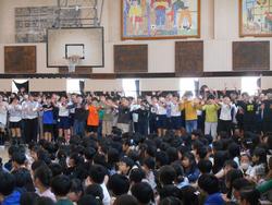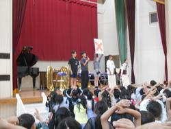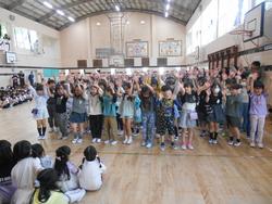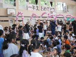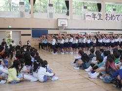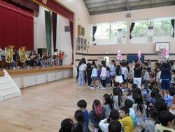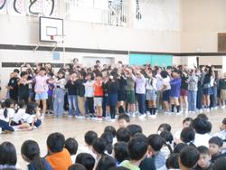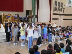 まず初めに、1年生から全校に向けて「これからよろしくお願いします」の意を込めて、各クラスごとで決めたポーズを取ります。1組となかよし、2組、3組、4組とそれぞれ違ったかわいらしいポーズを取ると小金っ子たちからは大きな拍手が沸き起こります。