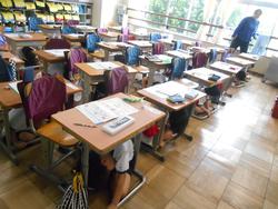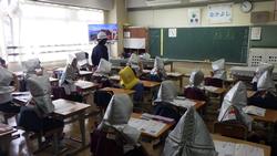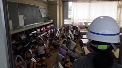 3年生は、机の下にもぐった後、地震の揺れが一旦おさまったところで防災頭巾をかぶり、二次避難場所である校庭に向かうために並ぶところまでしっかりとできていました(新しい教室になったため、各クラス事前に避難経路は確認しています)。