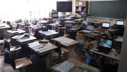 タブレット学習をしていてもさっと机の下に身を置くのは5年生。やはり、机の脚をしっかりと押さえて一次避難ができていて、これまでの訓練の積み重ねです。