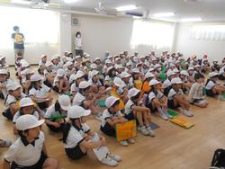幼稚園舎では3年生が集まっていました。どうやら「花笠音頭」の練習が始まるようです。下敷きを傘に見立てて練習。傘の返しが難しい踊りですがやる気に満ちている3年生でした。これから練習を積み重ね、上達していくのが楽しみです。