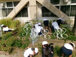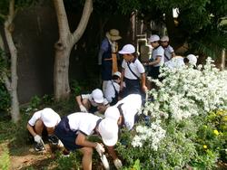 地区社協の方々のご指導のもと、3年生も花壇周りの草むしりを始めます。