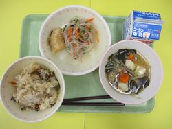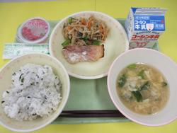 高菜チャーハン、白身魚のねぎ塩ソース、リャンバンザンスー、わかめスープ、牛乳