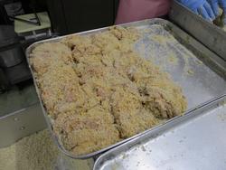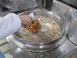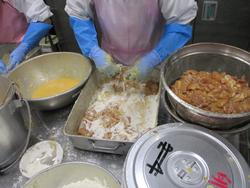 みそチキンカツは下味にみそを使っているのでしっかりとした味付けでした。みそが付いていることで焦げやすくなっているので、調理員さんは丁寧に衣を付けて揚げてくれました。