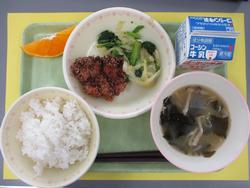 ごはん、生揚げのごまだれがけ、昆布茶和え、豆乳入りみそ汁、清見オレンジ、牛乳