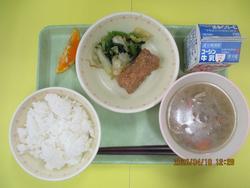 今日は春をイメージして、赤い皮が特徴の赤魚やさくらゼリーを出しました。給食初日から元気におかわりじゃんけんをしている様子が見られ、「給食楽しみにしてた!」、「わかめごはん大好き!」などの声を聞くことができました。