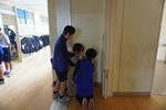 授業中、1年生が、長い物差しと手鏡をもって、廊下や教室を右往左往しているので、「?!」と思い近づいてみると・・・。光の反射の実験中でした。実験は一人が壁に手鏡をかざし、実験者はその手鏡に頭頂部が移ったら手鏡の位置の壁に付箋を貼ってもらい、次に、つま先が見えたらまたその位置で壁に付箋を貼ってもらうというものです。そして2枚の付箋の距離を測ると・・・、なんと、身長のおよそ半分の長さとなりました。(ちなみに私は86cmでした。実物より若干大きめです。)結果を見て、子どもたちは一斉に「なぜだろう。理由を解き明かしたい!!」という熱量が高まっていました。