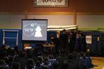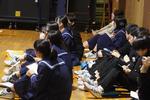 5時間目、1年生は校外学習の振り返りを武道場で行いました。1年生は、今日の集会を開く前、グループごとに校外学習で学んだ「おもてなしの心」を資料にまとめ、クラスごとに代表作品を選出しました。今日の集会はクラス代表による最終プレゼンでした。どのグループも、工夫を凝らしたまとめ資料を作り、クイズを入れるなどパフォーマンス力を発揮していました。先生方を含めオーディエンス側は、評価用紙を手にプレゼンを食い入るように聞いていました。学年最優秀の栄冠は1年3組のグループに輝いたようです。