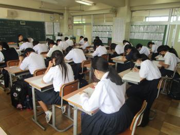 本日、3年生は第1回確認テストが行われました。集中して最後まであきらめずにテストにのぞんでいました。テストの後は進路に向けての集会が行われ、先生の話を真剣に聞いていました。応援団練習も始まり、明日は体育祭決起集会といよいよ体育祭に向けての取り組みが本格的になってきました。「早寝・早起き・朝ごはん」と十分な量の水分(水筒)を忘れずにお願いします。