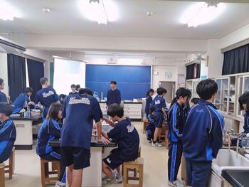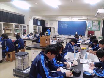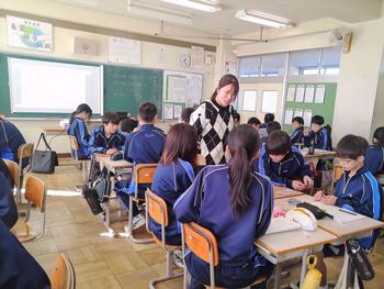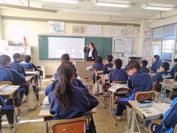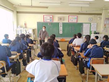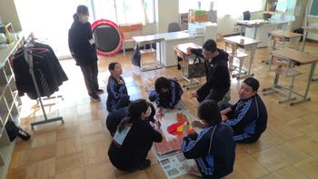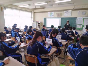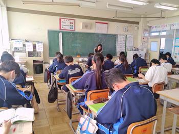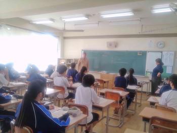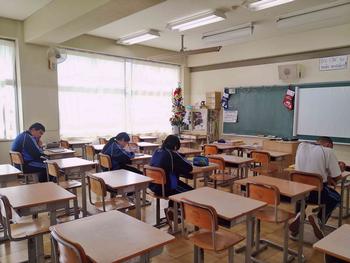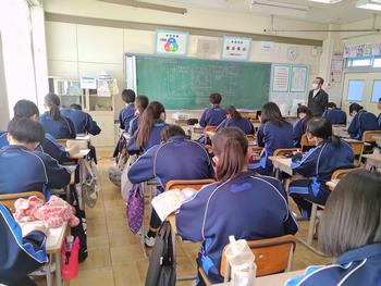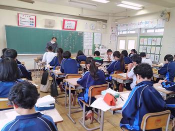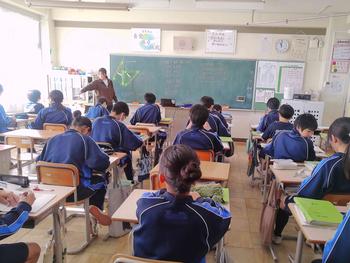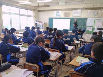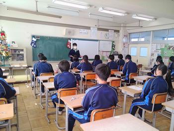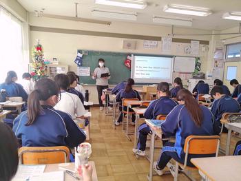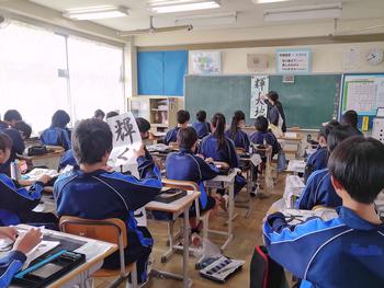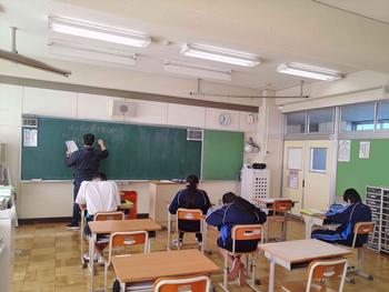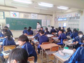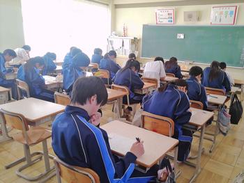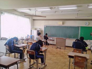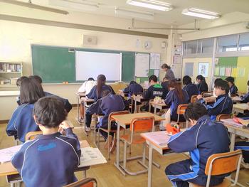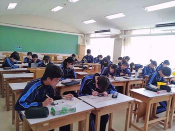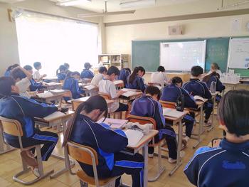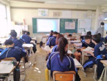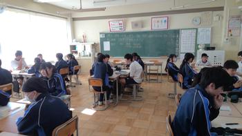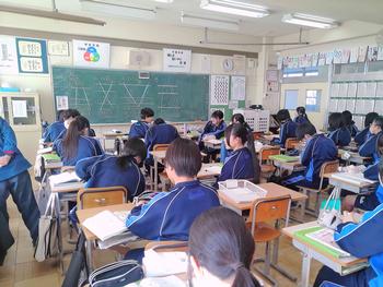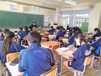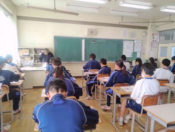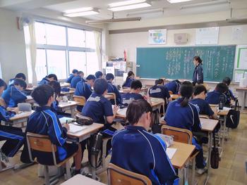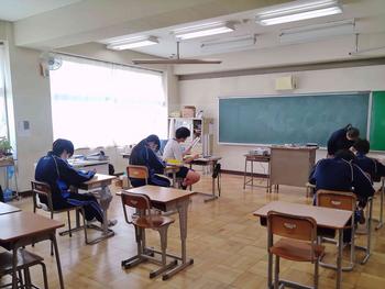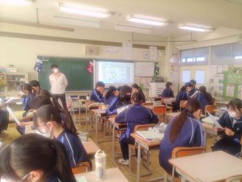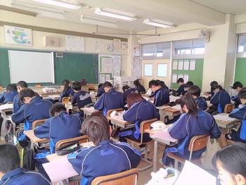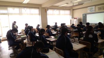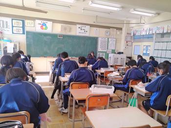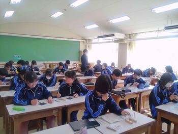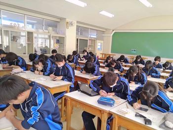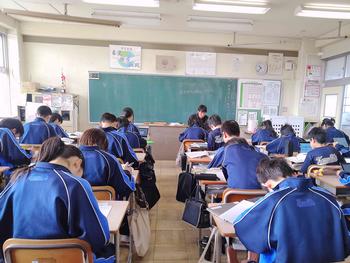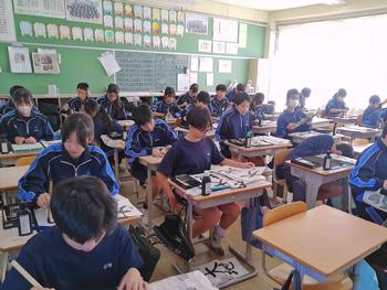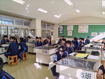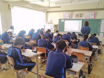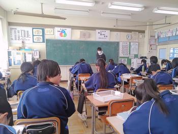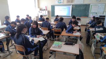 本日は、3年生は私立高校の入試相談のスタート日となっています。3年生は登校後、自宅学習となっています。2学年の家庭科では、調理実習を行いました。「肉じゃがとほうれん草のごま和え」です。グループで協力し合い、作った料理はきっと美味しかったことでしょう。冬休みに、お家で作ってもらってください。5組では英単語のクイズをやっていました。ヒントからスペルをみんなで考えてました。