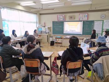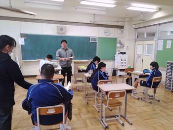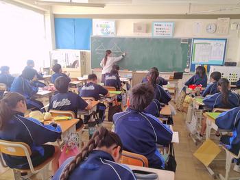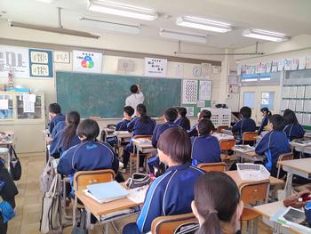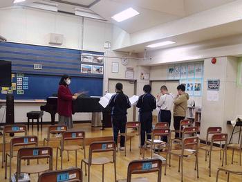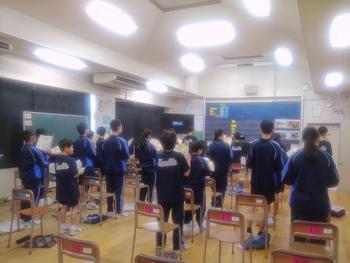 国語の授業では書き初めについての説明や実際に書く練習を行っていました。他の教科では、グループ学習や教え合い学習を行っていました。昔は、授業中横を向いたり、立ち歩くということは、ダメなこととされていましたが、最近の授業では、ペア学習やグループ学習が多くの場面で行われています。6時間目に、体育館からはキレイな歌声が聞こえてきました。その声の主はやっぱり3年生でした。体育館の工事は始まっていますが、工事の方々に相談し、体育館が使えるときは、使っています。