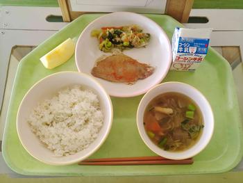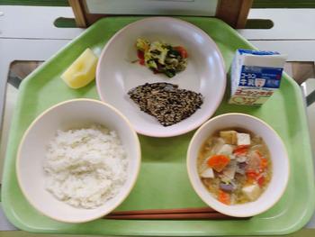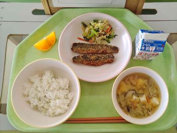今日のメニューは、ごはん、いわしの香味揚げ、かんぴょうのごま酢和え、豚汁、オレンジでした。