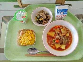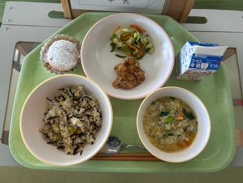 今日のメニューは、ひじきとベーコンのピラフ、スパイシーフライドチキン、茎わかめのノンオイルサラダ、小松菜と卵のスープ、セサミチョコケーキでした。今日で給食も終了です。2学期も安全でおいしい給食の提供をありがとうございました。