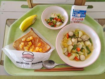 今日のメニューは、アップルシナモントースト、洋風おでん、ポン酢和え、バナナでした。